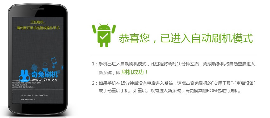 6、进入“一键刷机”模式之后,我们的奇妙之旅就开始啦。接下来设备进入自动刷机模式,大概5-15分钟后,即可完成奇酷手机的一键刷机!请务必耐心等待。